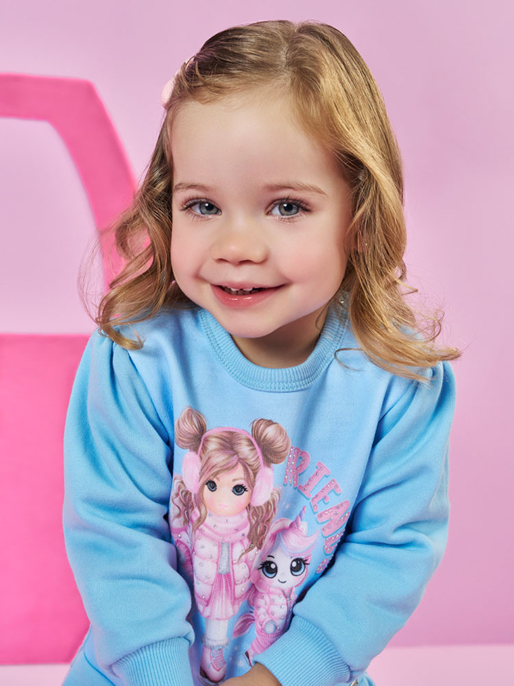 A estampa sublimada central traz a adorável Princesa Cinti junto a um amiguinho coelhinho, com detalhes em strass que iluminam a peça. Para facilitar ao vestir, o decote conta com abertura com 2 botões de pressão. A barra da parte do blusão e os punhos são talhados em Moletom, assegurando um ajuste confortável.